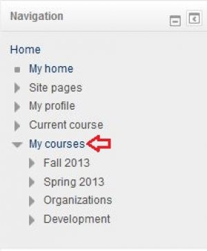 Next, in the Navigation block on the left hand side, click the drop down arrow next to "My courses", and locate the course you would like to view your grades in.